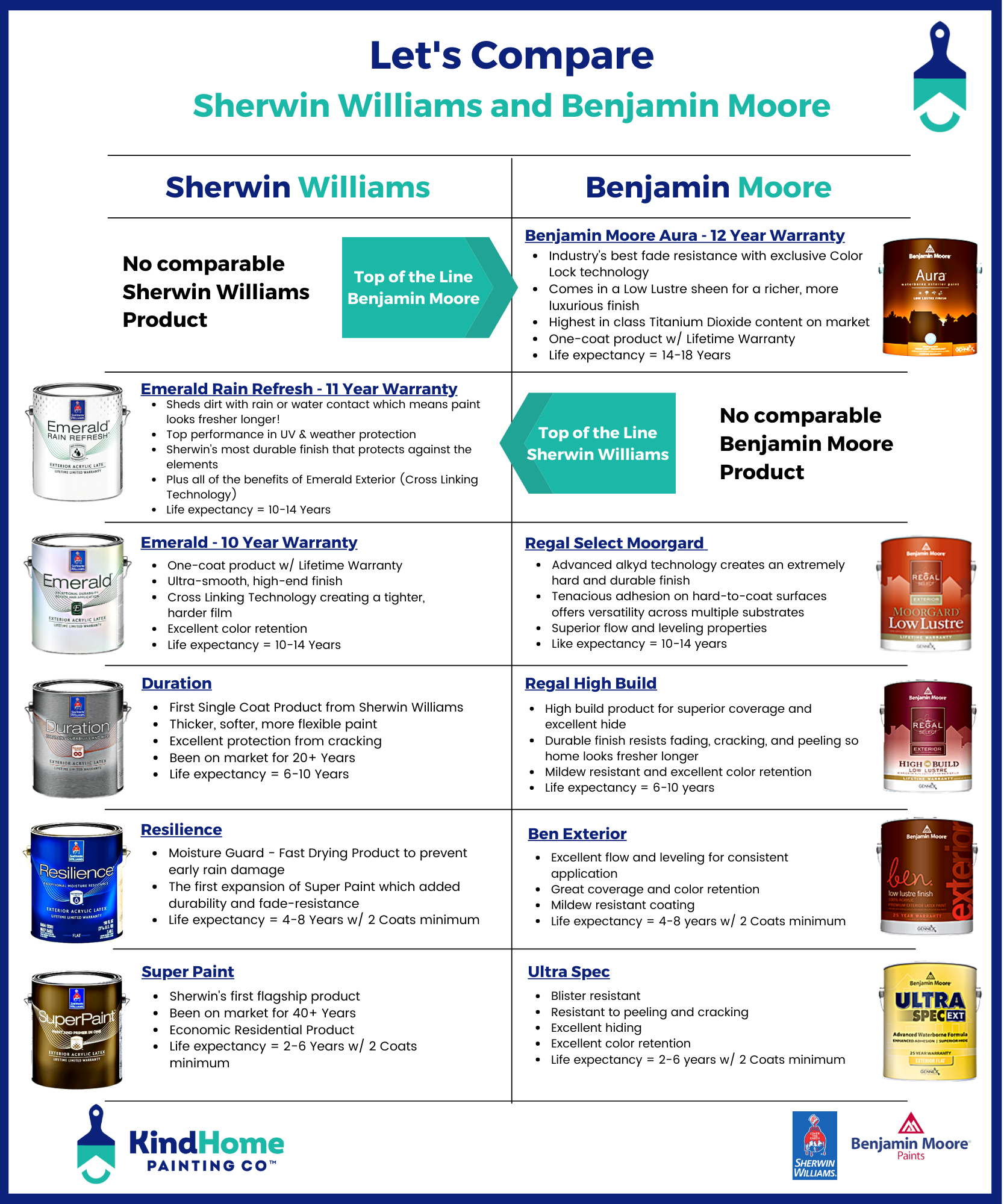 image comparing top exterior paints from Benjamin Moore and Sherwin Williams. The top paints include Benjamin Moore Aura and Sherwin Williams Rain Refresh